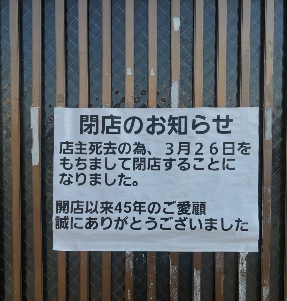 閉店情報 2025.04.27 閉店情報 閲覧数:146 Tweet Share RSS この記事のタイトルとURLをコピーする いわき市内郷駅前「丸亀寿司」さん 2025年3月26日を持ちまして、閉店されました。 職場が内郷にあった頃、何度かお世話になったお店です。 寂しいですねぇ。。。 白メガネ 荒川白メガネプロフィール 記事一覧 Facebook Twitter Instagram Youtube Contact Tweet Share RSS この記事のタイトルとURLをコピーする